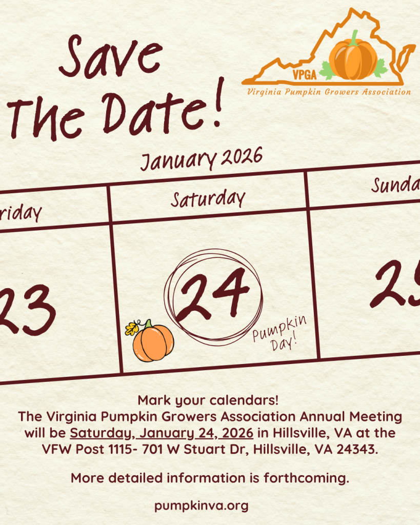 The 2026 Virginia Pumpkin Growers Association Annual Meeting will be Saturday, January 24, 2026 at a NEW LOCATION. This year, the meeting will be at the Grover King VFW Post 1115, 701 W Stuart Drive, Hillsville, VA 24343.